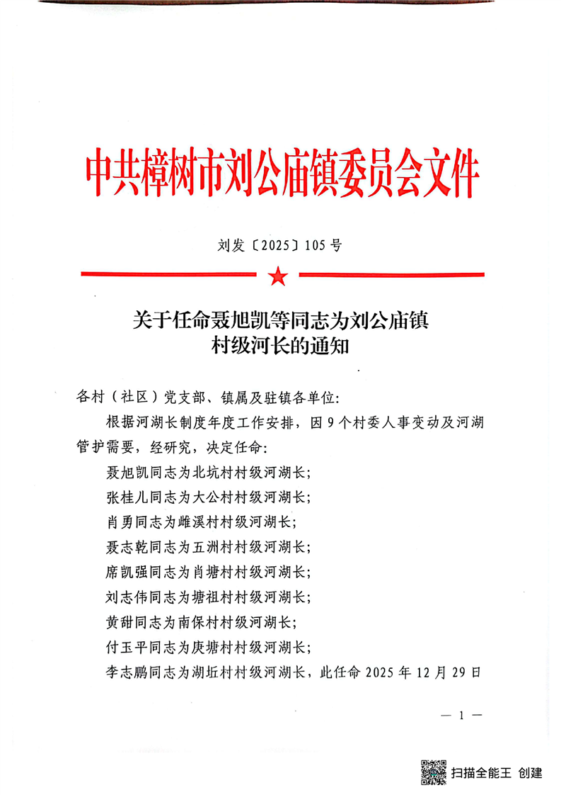 關于任命聶旭凱等同志為劉公廟鎮村級河長的通知