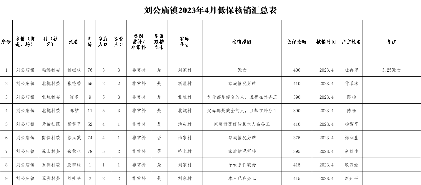 劉公廟鎮(zhèn)2023年4月低保核銷匯總表