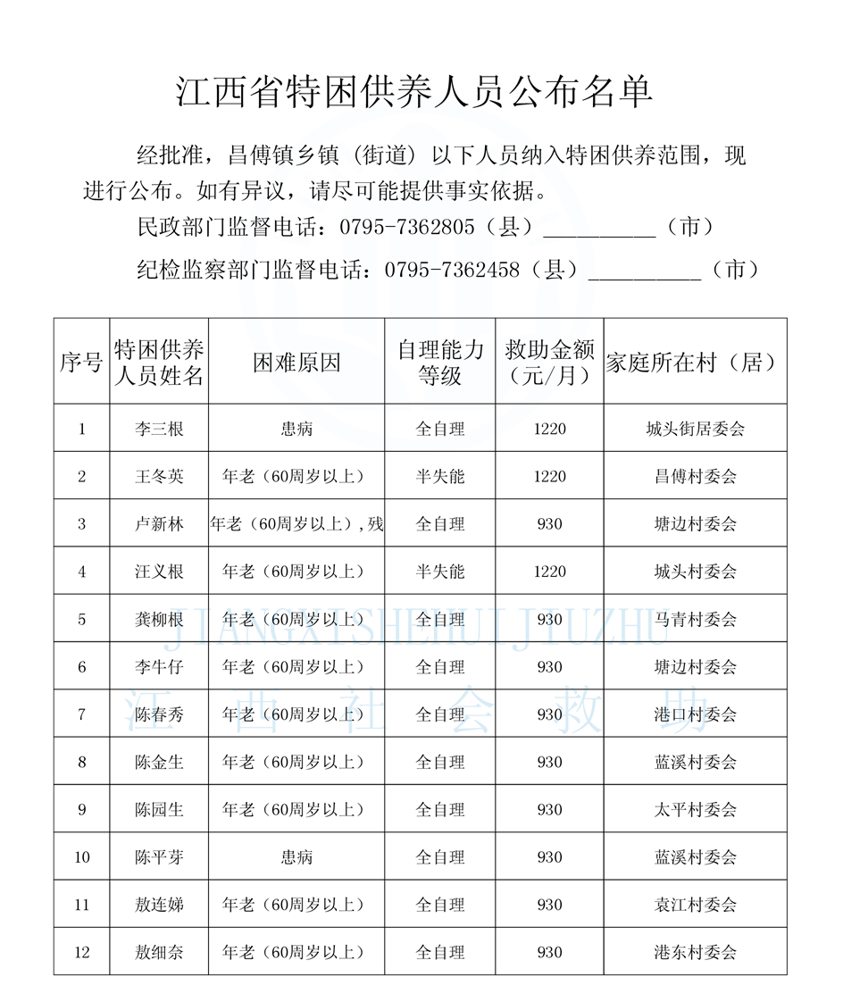 昌傅鎮(zhèn)2025年3月農(nóng)村分散特困人員公示表