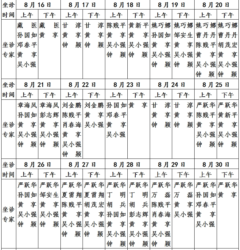 一直以來,樟樹市委、市政府高度重視中醫藥事業發展,為全力推進優質醫療資源共享共發展,保障樟樹市乃至全省范圍內廣大人民群眾享有高品質中醫醫療服務的需求,實現人民群眾“方便看中醫、放心用中藥、看上好中醫”的目標。2025年我市將繼續邀請省內外中醫專家深入樟幫中醫藥一條街國醫館坐診。屆時,各科專家將為您提供健康指導、答疑解惑及個性化的疾病診療服務。2025年8月專家坐診信息如下: