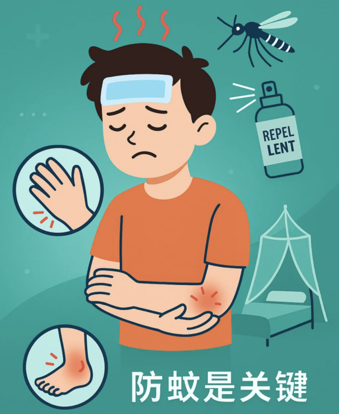 時刻關注個人身體狀況,從“兩熱”流行地區返回后14天內做好健康監測,一旦出現可疑癥狀,切勿自行服藥(尤其避免使用阿司匹林等可能加重出血風險的藥物)。如出現突發發熱、皮疹(多為充血性皮疹或點狀出血疹)和關節痛(多為小關節疼痛)等癥狀,應立即前往正規醫院發熱門診就診,就診時主動告知旅居史和蚊蟲叮咬情況,避免乘坐公共交通工具。