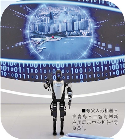 ■夸父人形機器人在青島人工智能創新應用展示中心擔任“導覽員”。
