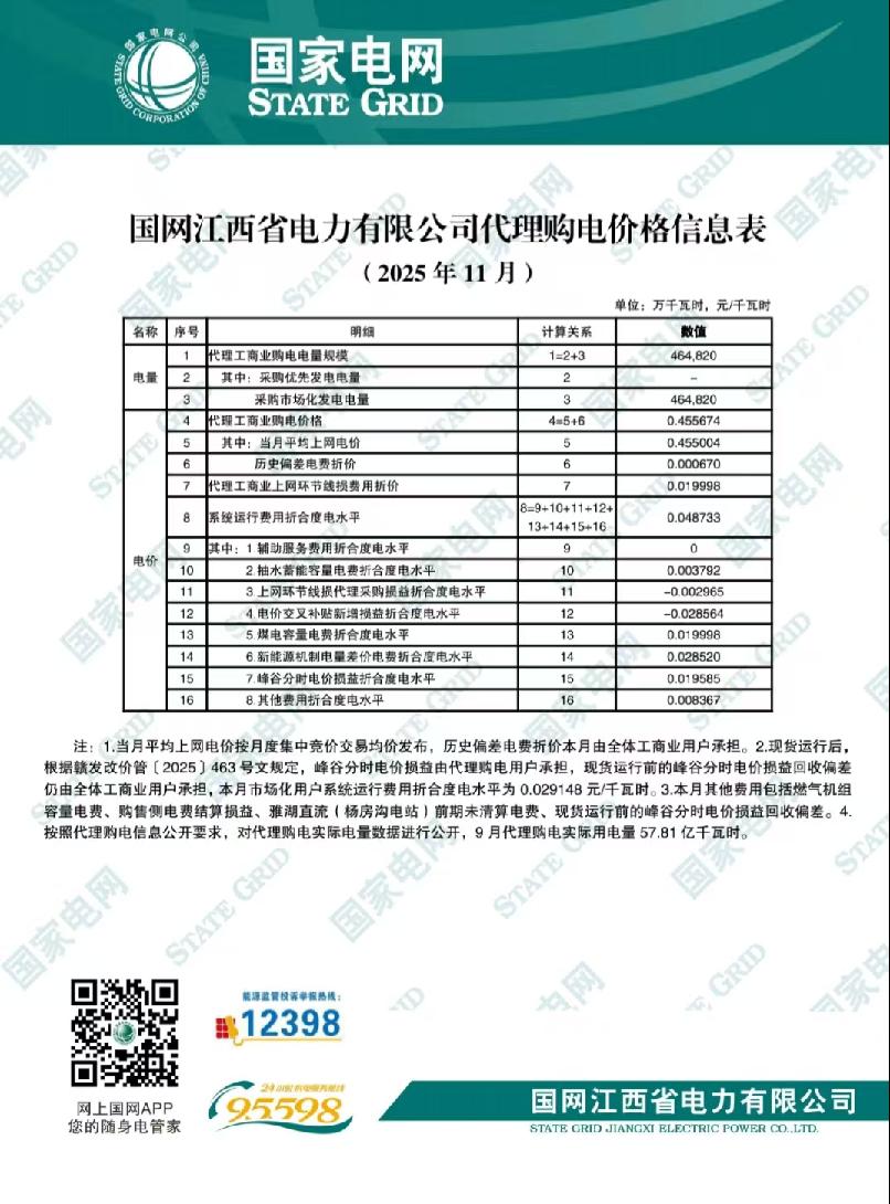 國(guó)網(wǎng)江西省電力有限公司代理購(gòu)電價(jià)格信息表(2025年11月)