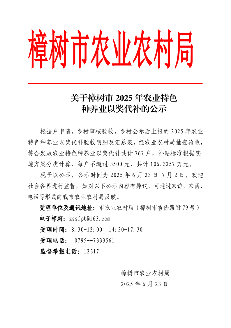 關于樟樹市2025年農業特色種養業以獎代補的公示