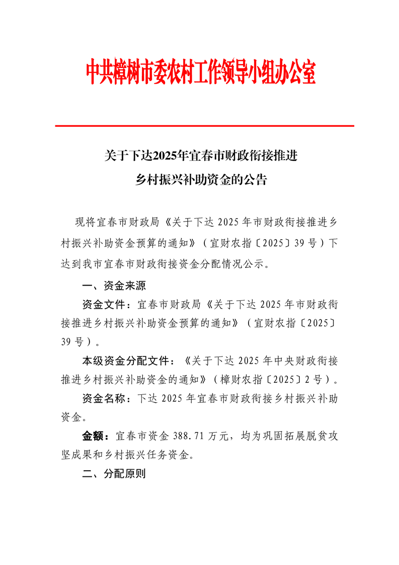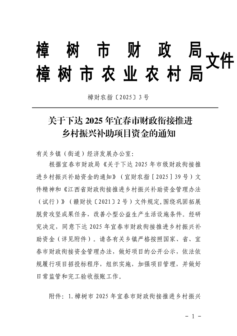 關于下達2025年宜春市財政銜接推進鄉村振興補助資金的公告