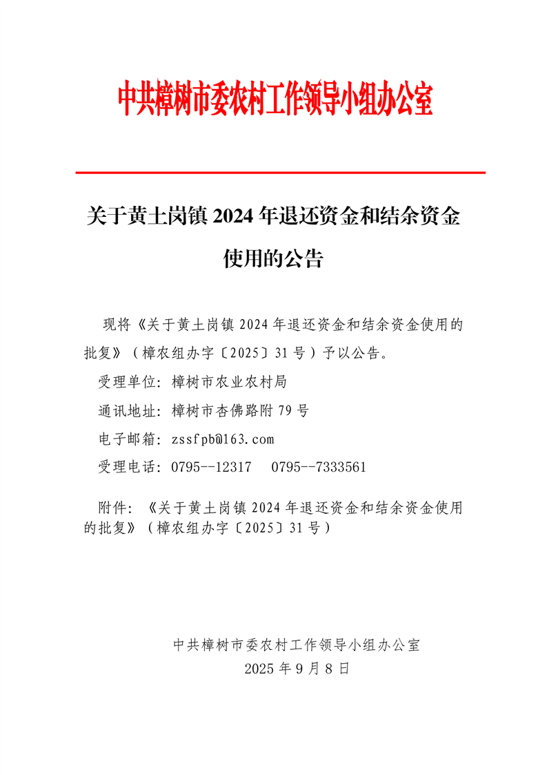 關于黃土崗鎮2024年退還資金和結余資金使用的公告