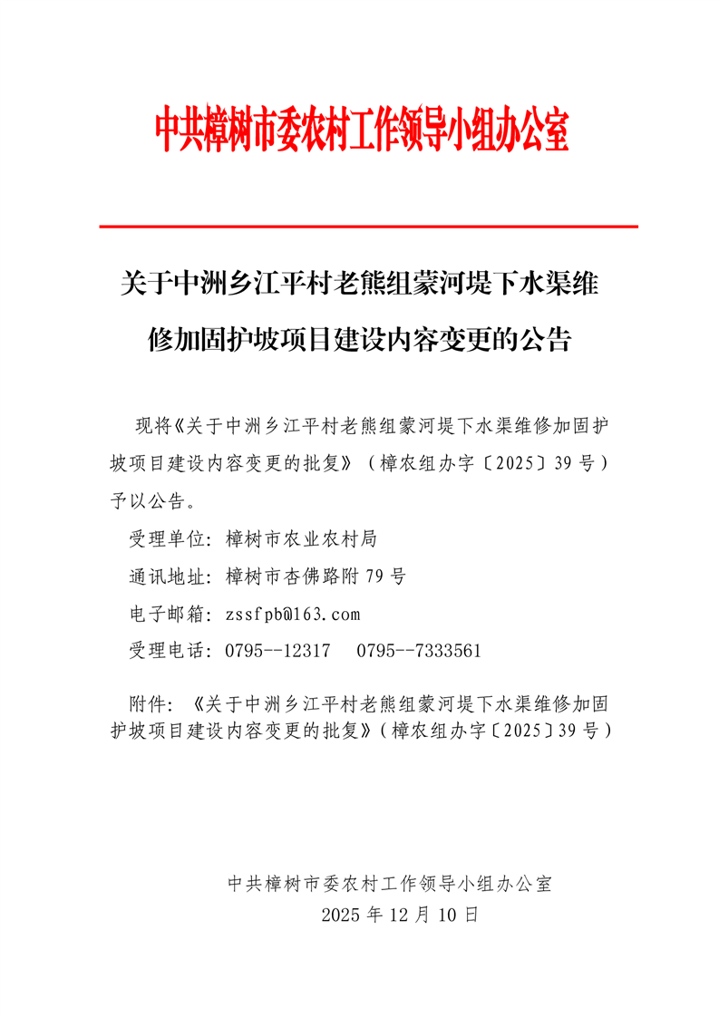 關于中洲鄉江平村老熊組蒙河堤下水渠維修加固護坡項目建設內容變更的公告