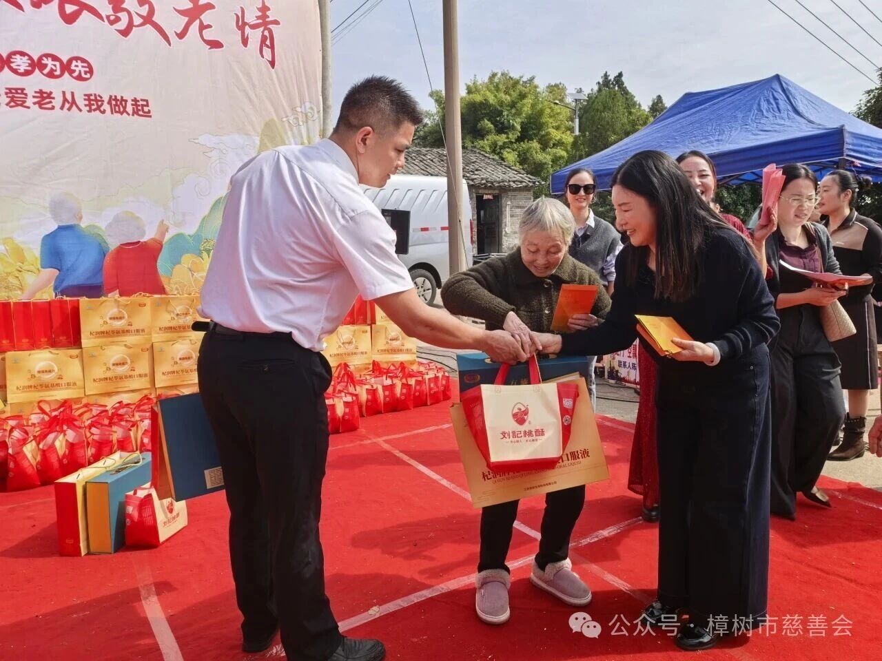 10月29日活動當天,樟樹市洲上鄉大洲古株樹村村委祠堂熱鬧非凡。江西省德上醫藥有限公司的工作人員們以及樟樹市慈善會的工作人員們早早抵達現場,將精心準備的慰問品“愛心大禮包”整齊擺放,每一份都承載著對老人的貼心考量。