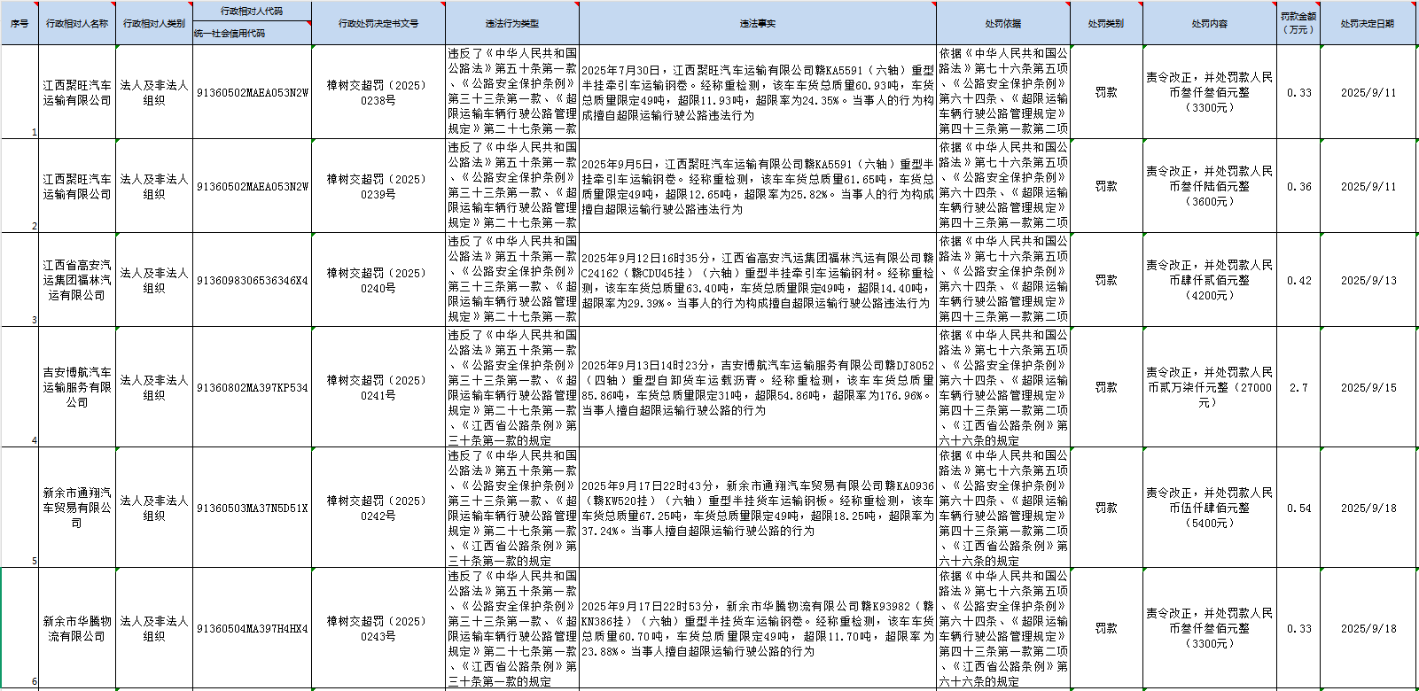 樟樹市交通運輸局行政處罰案件信息公開表(2025年9月)