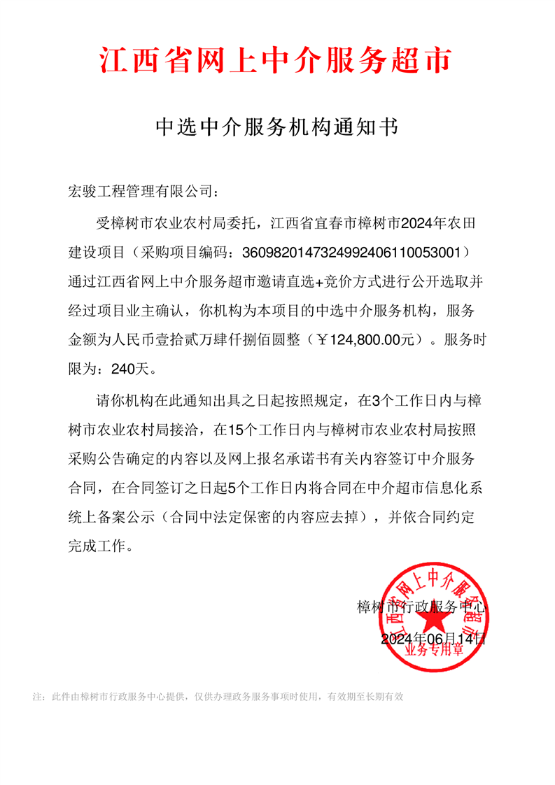 江西省宜春市樟樹市2024年農田建設項目中標通知書