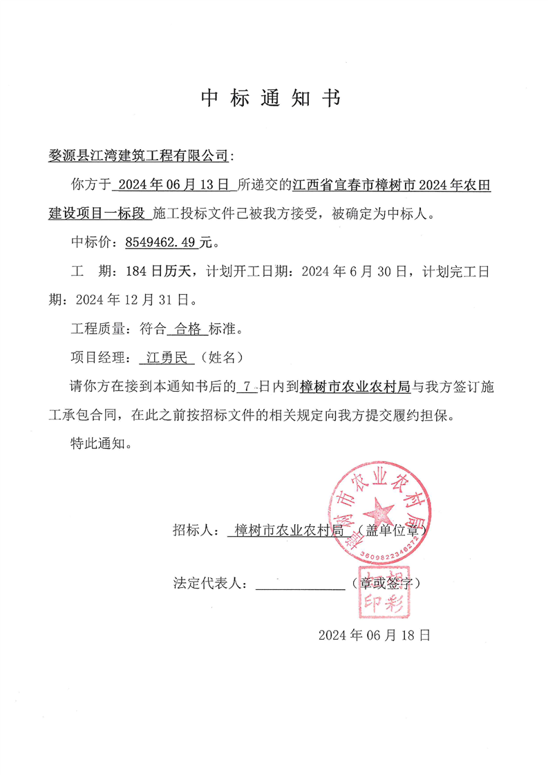 江西省宜春市樟樹市2024年農田建設項目一標段中標通知書