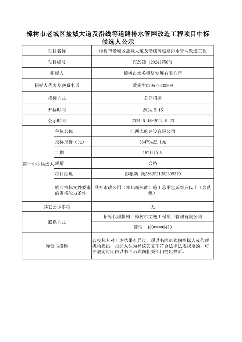 樟樹市老城區鹽城大道及沿線等道路排水管網改造工程(一期)中標候選人公示