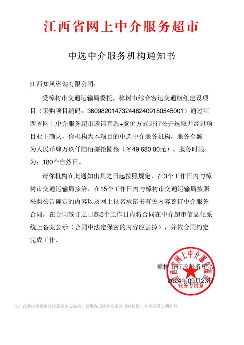 可研江西知風(fēng)咨詢有限公司中選通知書