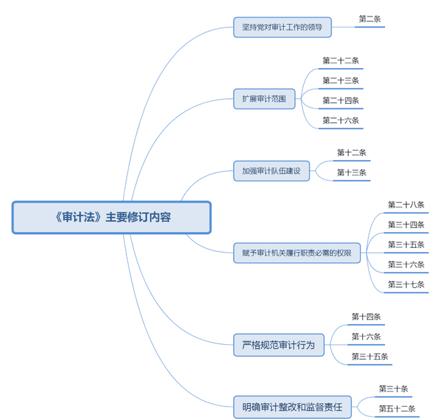 從主要內(nèi)容看,本次審計法修改,可簡要概括為:一個重大修改、一個繼續(xù)關(guān)注、三個重大拓展、兩個相應完善。具體可分為七個方面: