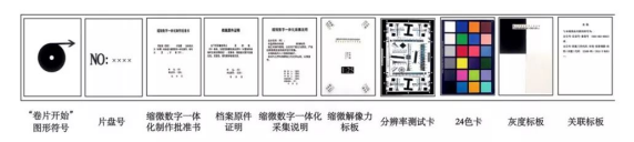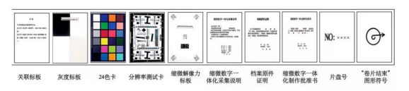 后標(biāo)識(shí)區(qū)標(biāo)板包括:關(guān)聯(lián)標(biāo)板、灰度標(biāo)板、24色卡、分辨率測(cè)試卡、縮微解像力標(biāo)板、縮微數(shù)字一體化采集說(shuō)明、檔案原件證明、縮微數(shù)字一體化制作批準(zhǔn)書、片盤號(hào)、“卷片結(jié)束”圖形符號(hào)(如圖3所示)。