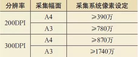 當(dāng)A4幅面清晰度要求達(dá)到200DPI時(shí),采集系統(tǒng)像素設(shè)定應(yīng)不小于390萬(wàn)像素,達(dá)到300DPI時(shí),采集系統(tǒng)像素設(shè)定應(yīng)不小于870萬(wàn)像素;A3幅面清晰度要求達(dá)到200DPI時(shí),采集系統(tǒng)像素設(shè)定應(yīng)不小于780萬(wàn)像素,達(dá)到300DPI時(shí),采集系統(tǒng)像素設(shè)定應(yīng)不小于1740萬(wàn)像素。