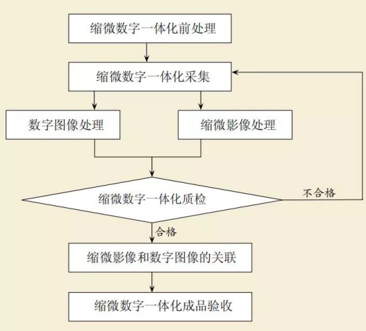 1.縮微數(shù)字一體化加工基本流程紙質(zhì)檔案縮微數(shù)字一體化加工基本環(huán)節(jié)包括:縮微數(shù)字一體化前處理、縮微數(shù)字一體化采集、數(shù)字圖像處理和縮微影像處理、縮微影像和數(shù)字圖像的關(guān)聯(lián)、縮微數(shù)字一體化成品驗(yàn)收(如圖1所示)。