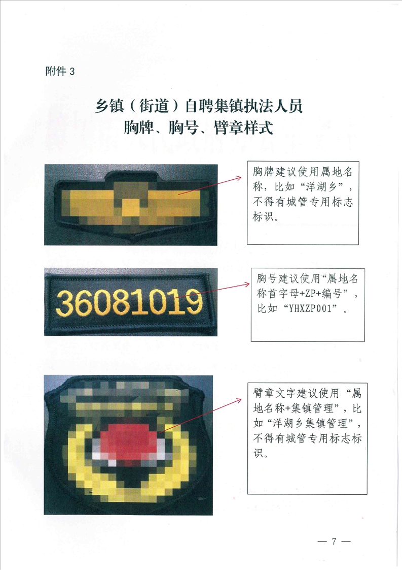 鄉鎮(街道)在編在崗集鎮執法人員若需穿著城管制式服裝,需嚴格按照市城管局執法人員著裝規范,統一穿著制服,但胸號由市城管局進行統一編號,且胸號、胸牌及臂章應區別于市城管局執法人員,具體樣式如附件1。