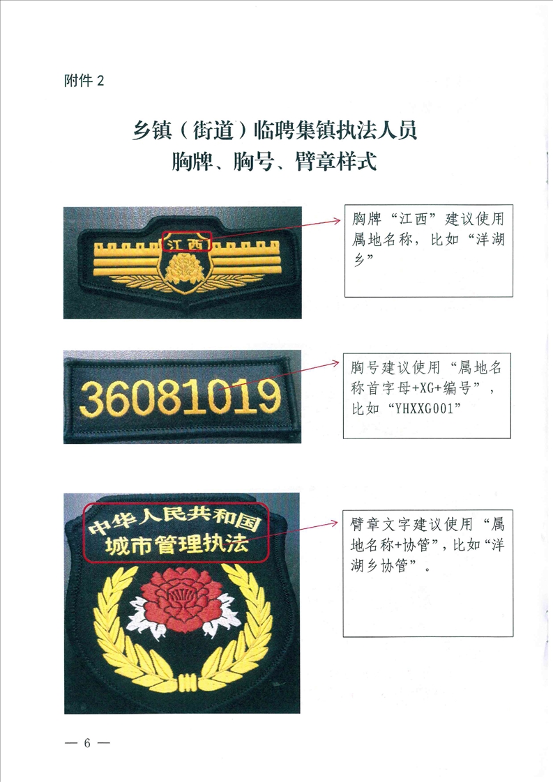 鄉鎮(街道)臨聘集鎮執法人員若需穿著城管制式服裝,需同時滿足以下條件:1.臨時聘用人員嚴格按照《樟樹市人才發展管理實施辦法》(樟辦發〔2022〕4號)文件要求進行招聘,與鄉鎮(街道)簽訂勞動合同;2.胸號由市城管局進行統一編號,且胸號、胸牌及臂章應區別于市城管局輔助執法人員,具體樣式如附件2。