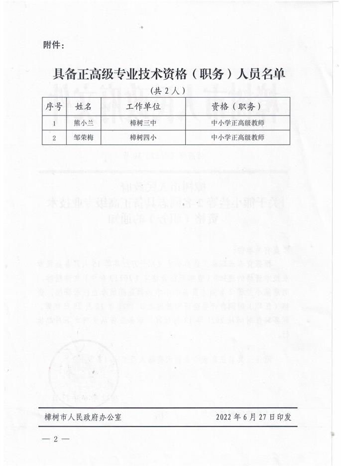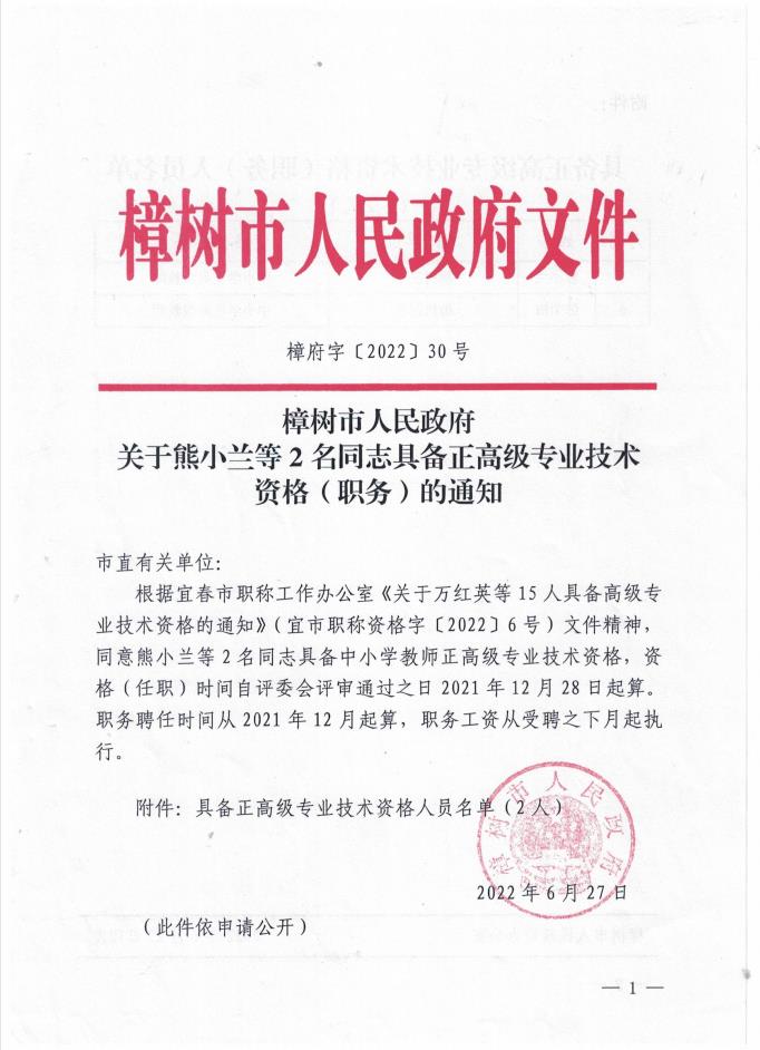 樟府字〔2022〕30號(hào)關(guān)于熊小蘭等2名同志具備正高級(jí)專業(yè)技術(shù)資格(職務(wù))的通知