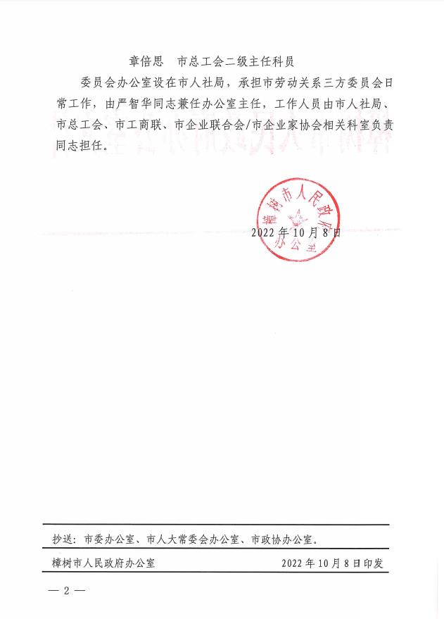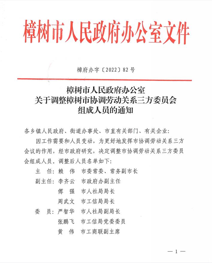 樟府辦字〔2022〕82 號(hào)關(guān)于調(diào)整樟樹(shù)市協(xié)調(diào)勞動(dòng)關(guān)系三方會(huì)議組成人員的通知