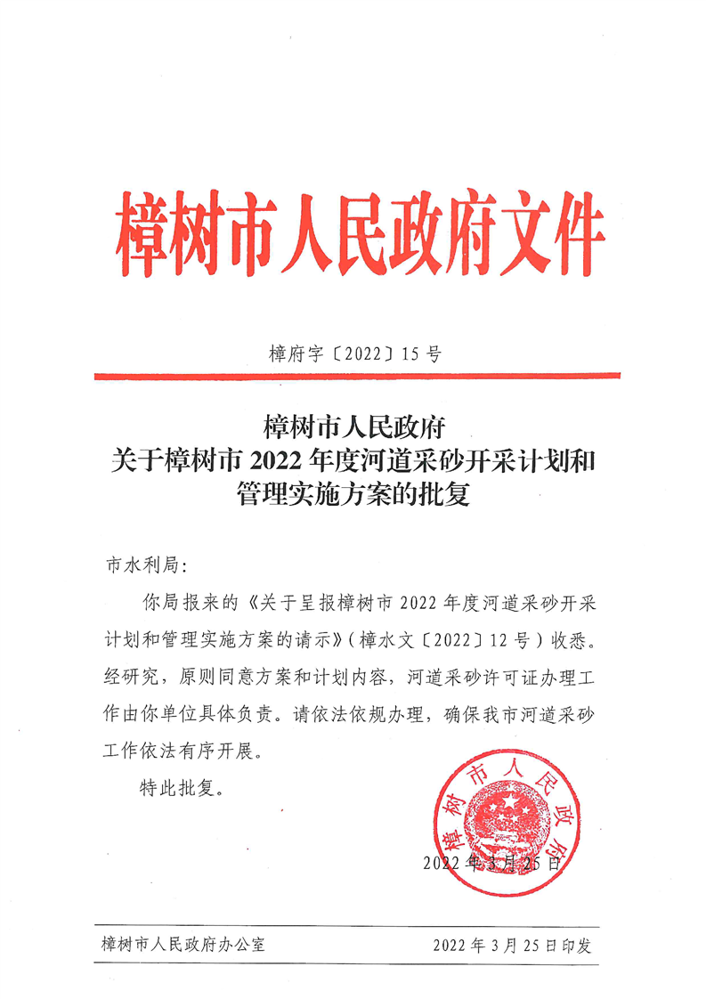 樟府字〔2022〕15號 關于樟樹市2022年度河道采砂開采計劃和管理實施方案的批復