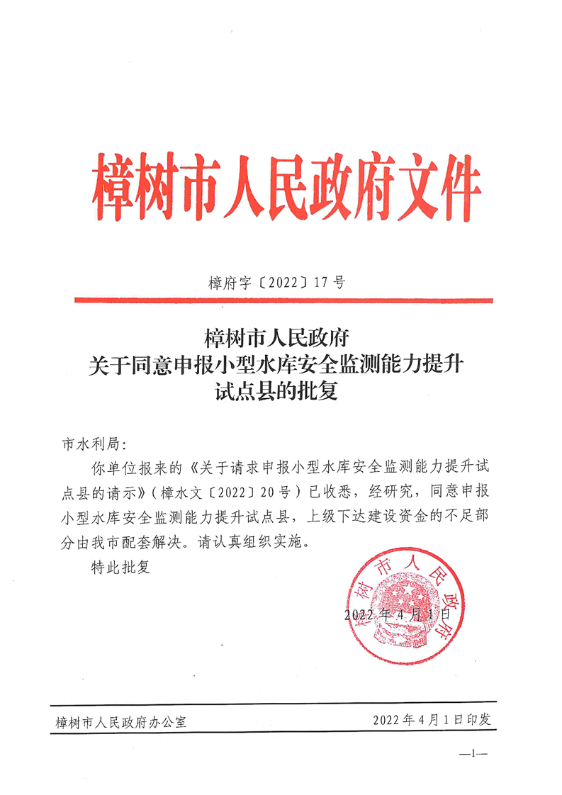 樟府字〔2022〕17號 關于同意申報小型水庫安全監測能力提升試點縣的批復