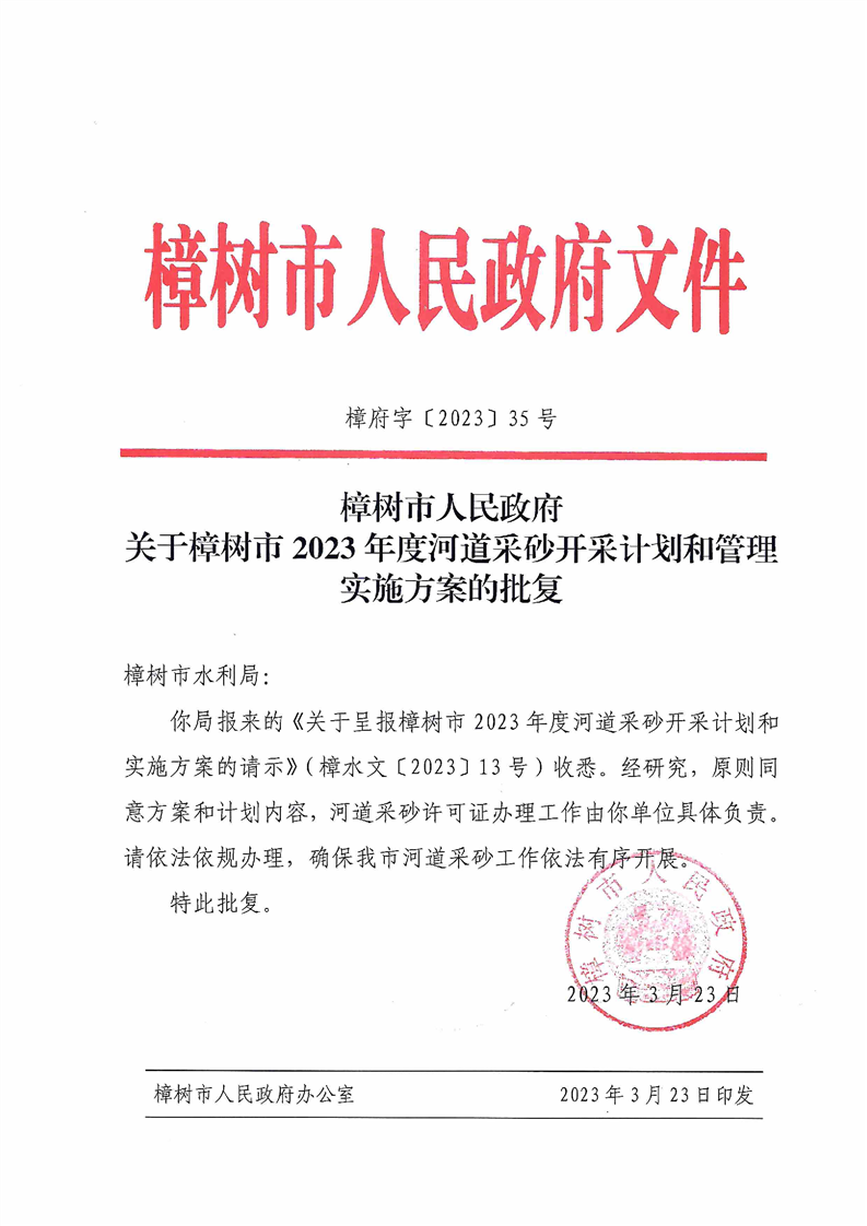 樟府字〔2023〕35號(hào) 關(guān)于樟樹市2023年度河道采砂開采計(jì)劃和管理實(shí)施方案的批復(fù)
