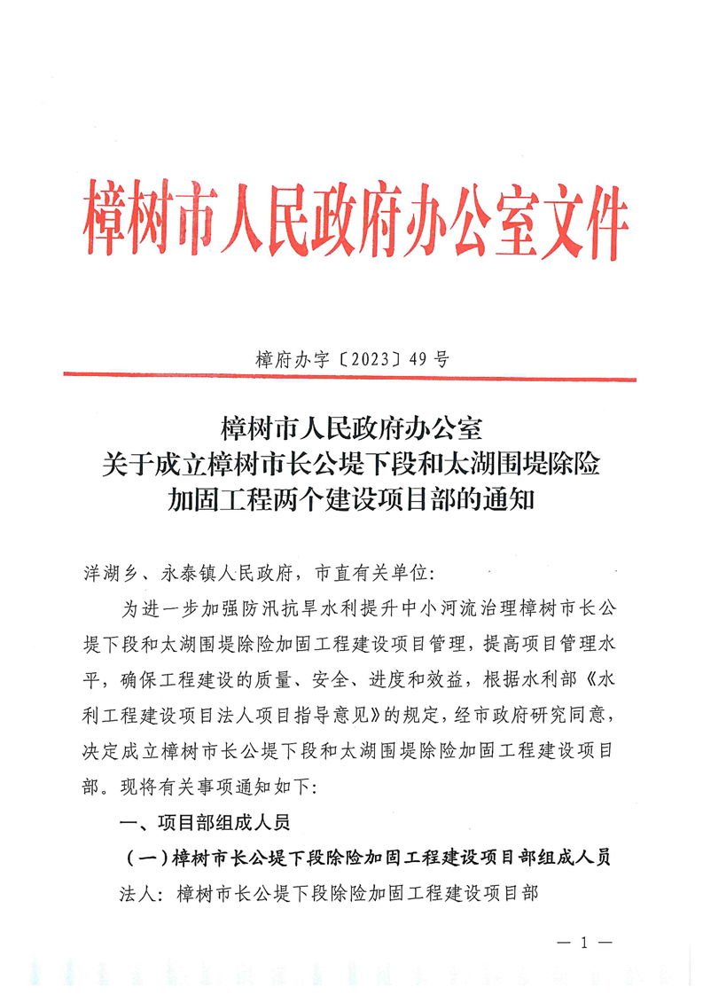 樟府辦字〔2023〕49號+關于成立樟樹市長公堤下段和太湖圍堤除險加固工程兩個建設項目部的通知