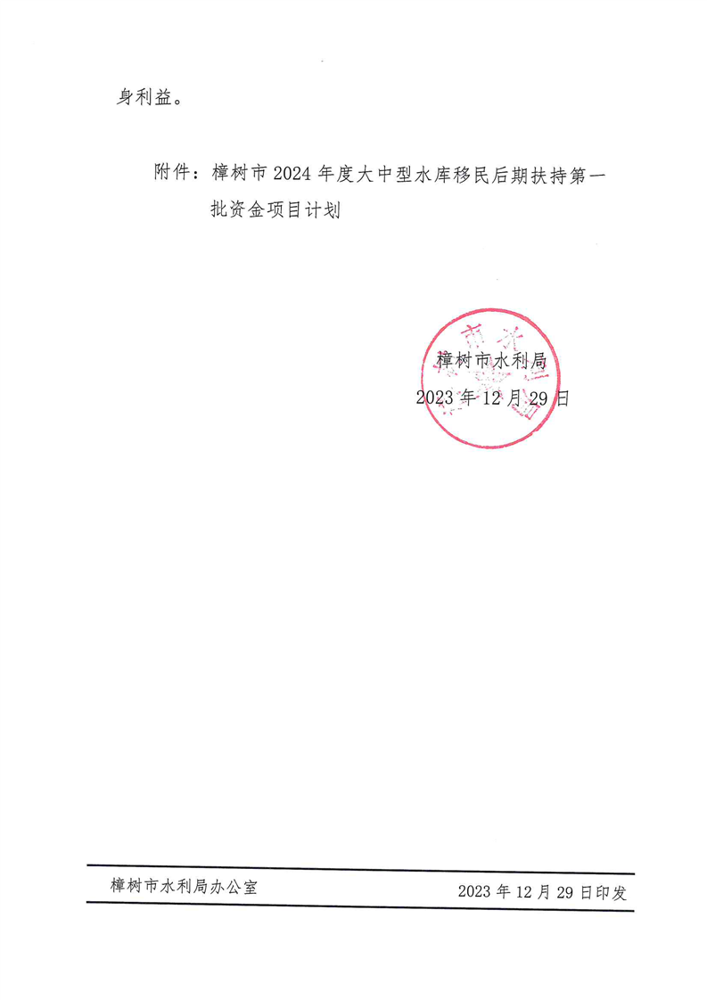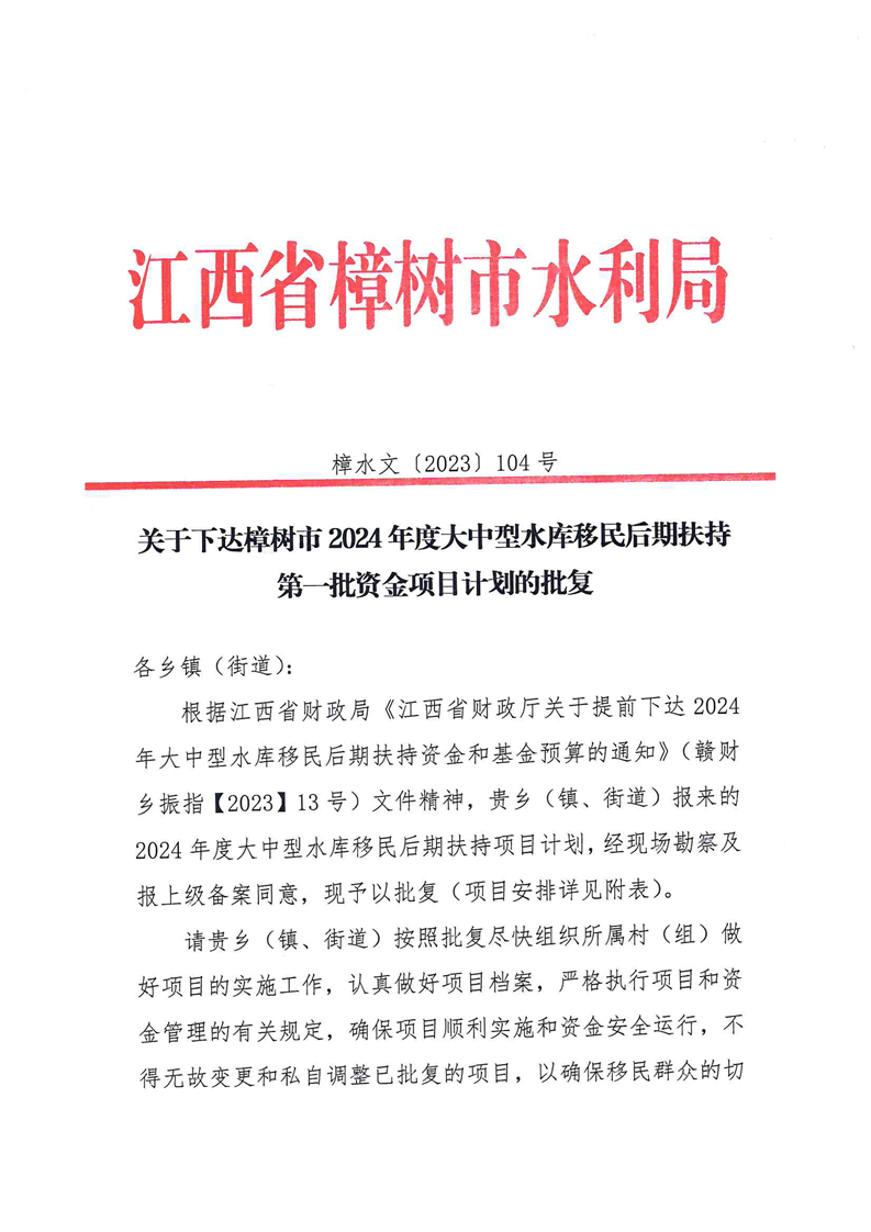 關于下達樟樹市2024年度大中型水庫移民后期扶持第一批資金項目計劃的批復