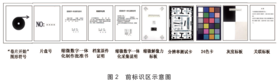 6.2.2.3 前標(biāo)識(shí)區(qū)包括:“卷片開(kāi)始”圖形符號(hào)、片盤(pán)號(hào)、縮微數(shù)字一體化制作批準(zhǔn)書(shū)、檔案原件證明、縮微數(shù)字一體化采集說(shuō)明、縮微解像力標(biāo)板、分辨率測(cè)試卡、24色卡、灰度標(biāo)板、關(guān)聯(lián)標(biāo)板。前標(biāo)識(shí)區(qū)示意圖見(jiàn)圖2。