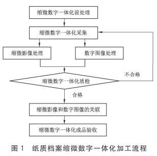 4.2 紙質(zhì)檔案縮微數(shù)字一體化加工流程紙質(zhì)檔案縮微數(shù)字一體化加工的基本環(huán)節(jié)包括:縮微數(shù)字一體化前處理、縮微數(shù)字一體化采集、縮微影像和數(shù)字圖像的處理、縮微數(shù)字一體化質(zhì)檢、縮微影像和數(shù)字圖像的關(guān)聯(lián)、縮微數(shù)字一體化成品驗(yàn)收等。具體流程見(jiàn)圖1。