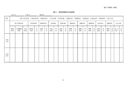 5.6.1 應(yīng)根據(jù)情況制定符合實(shí)際要求的紙質(zhì)檔案數(shù)字化工作文件,以此加強(qiáng)對數(shù)字化工作的管理。主要包括紙質(zhì)檔案數(shù)字化工作方案、紙質(zhì)檔案數(shù)字化審批書、紙質(zhì)檔案數(shù)字化流程單、數(shù)據(jù)驗(yàn)收單、項(xiàng)目驗(yàn)收報(bào)告、紙質(zhì)檔案數(shù)字化成果移交清單等,采取外包方式實(shí)施時(shí),還應(yīng)包括項(xiàng)目招標(biāo)文件、投標(biāo)文件、中標(biāo)通知書、項(xiàng)目合同、保密協(xié)議等。部分工作單示例參見附錄B。