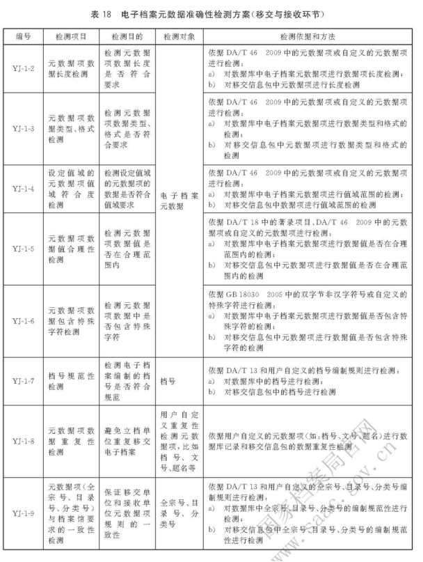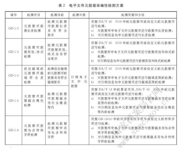 檢測歸檔電子文件元數據是否符合DA/T 46一2009 等標準或自定義元數據方案要求,包括數據長度、類型、格式、值域以及元數據項賦值是否合理等。