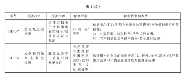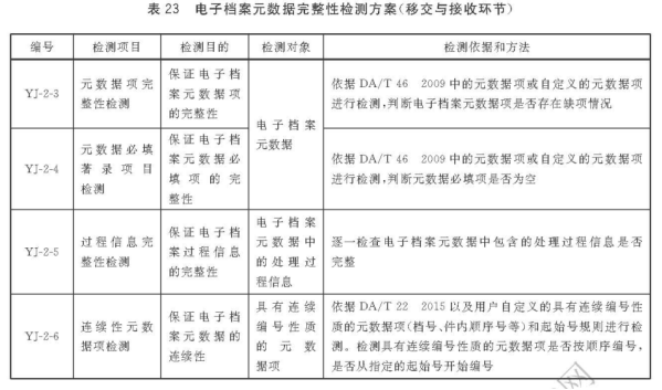 對照 DA/T 46一2009 或自定義元數據方案,檢測元數據項是否齊全完整;反映重要問題的歸檔電子文件是否包括主要修改過程和辦理情況記錄;具有連續編號的元數據項(比如歸檔號、件內順序號等)是否有漏號現象等。
