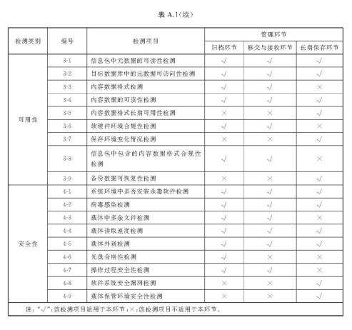 監于歸檔環節、移交與接收環節,長期保存環節是確保電子檔案真實性、完整性、可用性和安全性的關鍵性環節,因此本標準針對上述環節分別給出檢測的內容和方案。