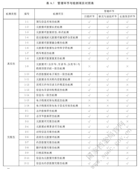 檢測項目總計45項,包括真實性、完整性、可用性、安全性四個類別,其中真實性檢測項目16項,完整性檢測項目11項,可用性檢測項目9項,安全性檢測項目9項,覆蓋電子文件歸檔環節電子檔案移交與接收環節和電子檔案長期保存環節。管理環節與檢測項目的對照表參見附錄A。