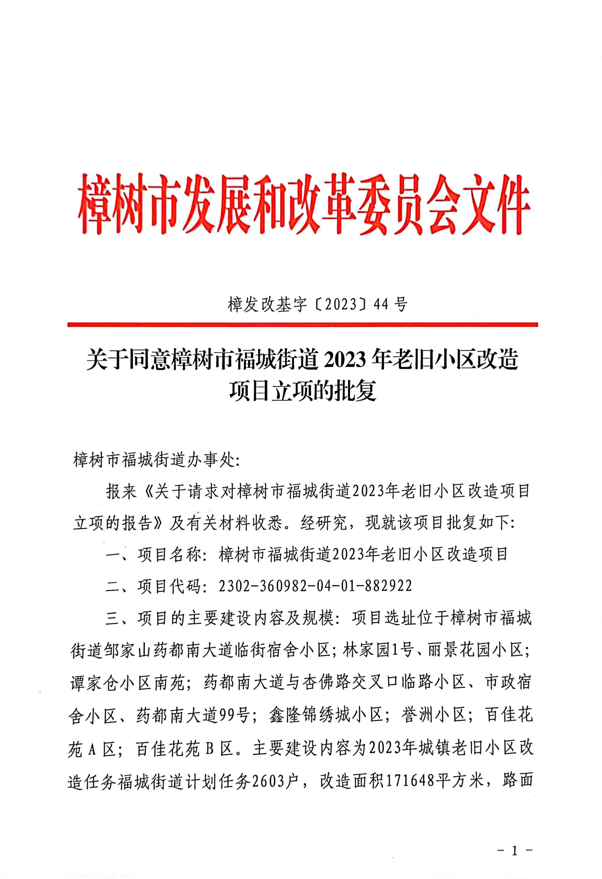 福城街道2023年老舊小區(qū)改造項(xiàng)目立項(xiàng)的批復(fù)