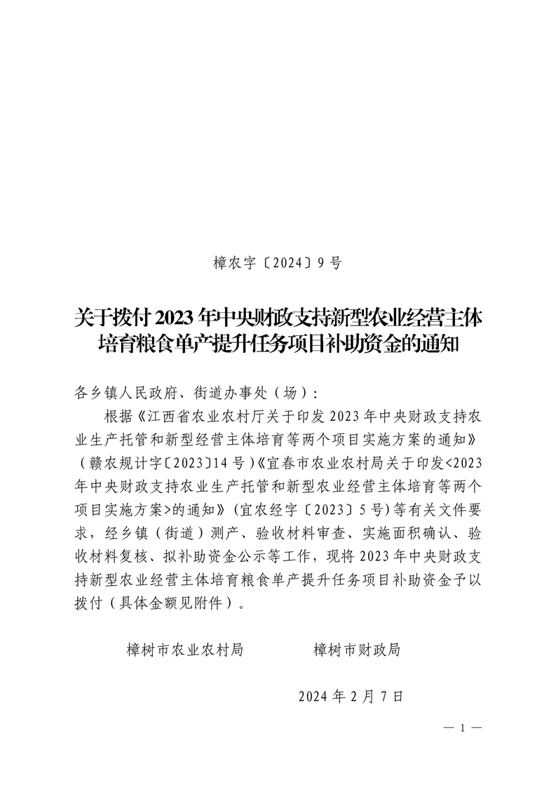 樟農字〔2024〕9號關于撥付2023年中央財政支持新型農業經營主體培育糧食單產提升任務項目補助資金的通知