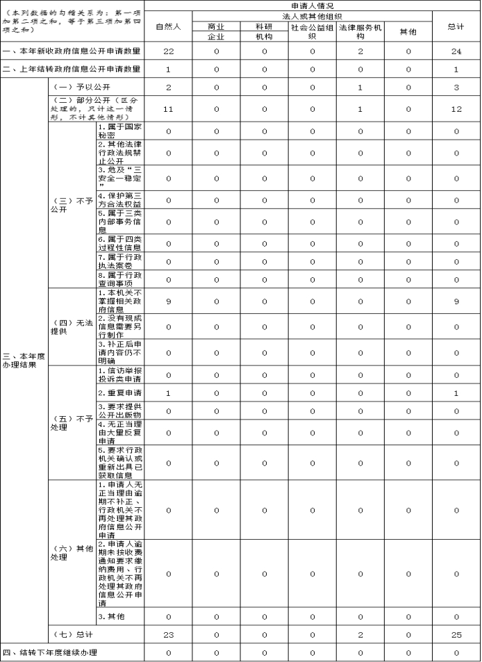 2025年,我局共辦理政府信息公開申請25件(其中新收申請24件,含個(gè)人申請22件、法律服務(wù)機(jī)構(gòu)申請2件;上年度結(jié)轉(zhuǎn)1件)。所有申請均按照《條例》規(guī)定的時(shí)限、程序和要求辦理完畢,辦結(jié)率達(dá)100%。在辦理過程中,我局嚴(yán)格落實(shí)申請登記、辦理、答復(fù)、歸檔等全流程規(guī)范管理,確保每一件申請都能得到依法、及時(shí)、高效地回應(yīng)。