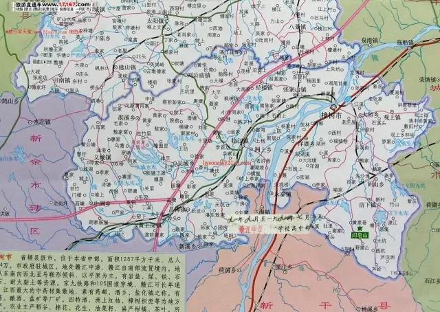 贛江(清江),贛江是長江主要支流之一,江西省最大河流。位于長江中下游南岸,源出贛閩邊界武夷山西麓,自南向北縱貫全省。贛江經新干縣下洲入境,過永泰鎮、洲上鄉、洋湖鄉及樟樹市西,東北折經張家山街道、大橋街道,于牛灣洲出豐城。境內長28.4公里,占主河長度的3.84%。贛江出峽江縣境后,進入平原,水勢漶漫 【huàn màn模糊不清的含義】 。古時在新干、清江兩縣境內,曾多次改道,為害至烈。宋嘉泰元年(1201)以前,贛江自新干三湖鎮龍窩口至橫灘洲一帶,瓜蔓【wàn】水長,形成眾多湖泊。加以袁河自三江口分流,東至龍富口會贛江,江面寬闊,水勢更盛,且波流澄澈,得名“清江”。