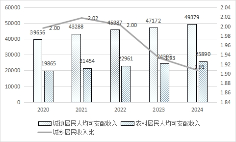 82020-2024年城鎮、農村居民可支配收入及城鄉居民收入比