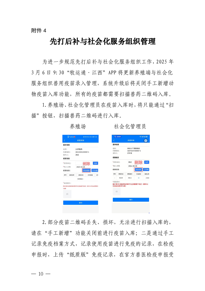 為進一步規范先打后補與社會化服務組織工作,“牧運通·江西”APP 將更新養殖端與社會化服務組織獸用疫苗錄入管理,系統升級后將關閉手工新增動 物疫苗入庫功能,所有的疫苗都需要掃描獸藥二維碼入庫,詳細情況請參閱附件1或咨詢當地鄉鎮、街道獸醫站工作人員。