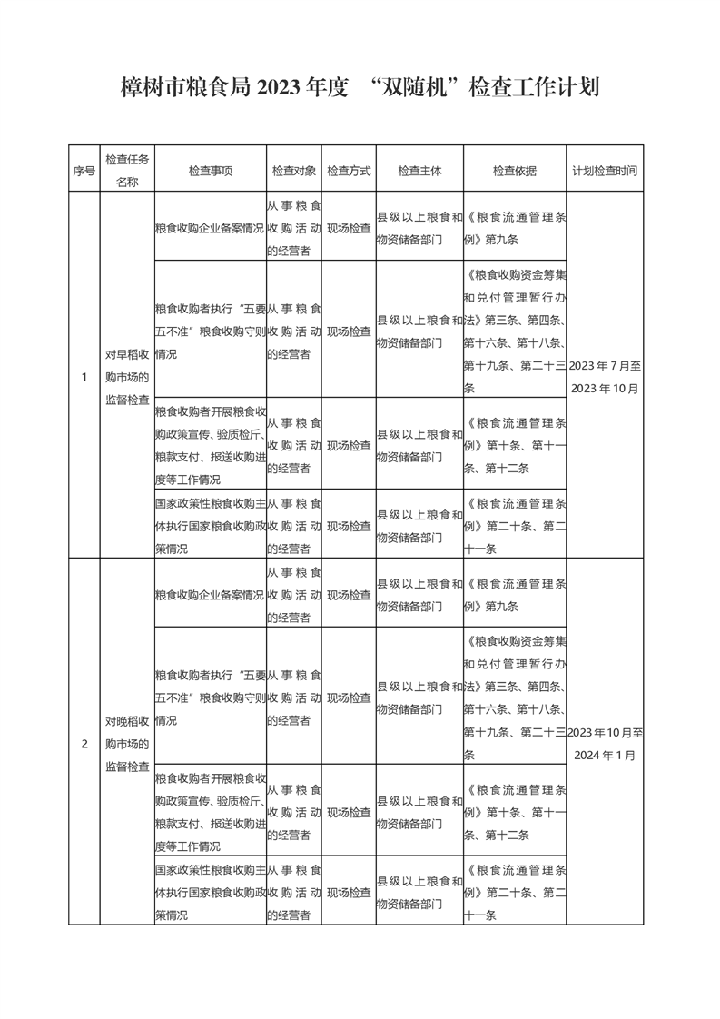 樟樹市糧食局2023年度“雙隨機”檢查工作計劃
