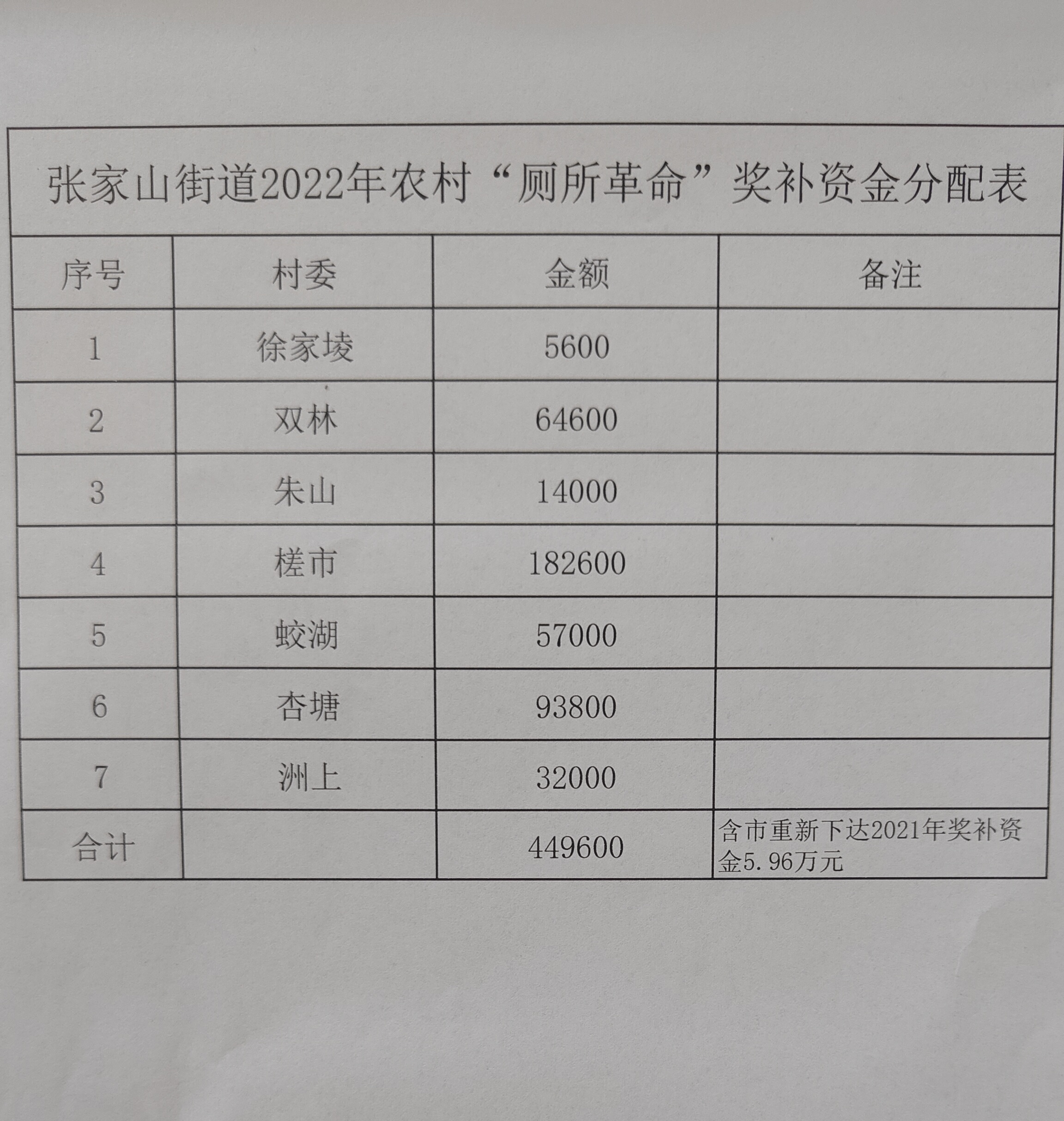 張家山街道2022年農(nóng)村“廁所革命”獎(jiǎng)補(bǔ)資金分配表