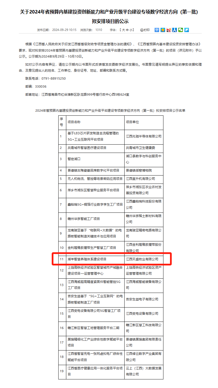 近日,2024年省預算內基建投資創新能力和產業升級平臺建設專項數字經濟方向(第一批)的項目進行公示。全省共19個項目入選,其中宜春有兩個項目入選,我市江西天盛牧業有限公司湖羊智慧養殖體系建設項目為其中之一。